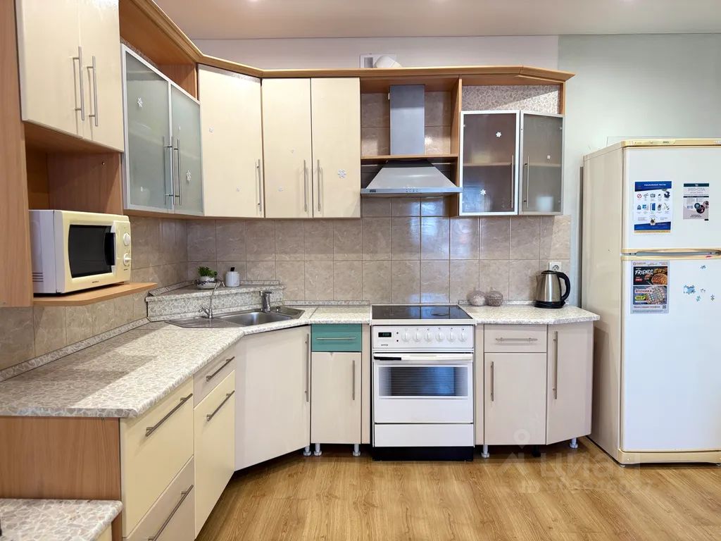 Современная бытовая техника: электрическая плита, вытяжка, двухкамерный холодильник, электрочайник, СВЧ, фен, утюг, стиральная машина.