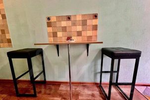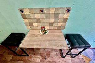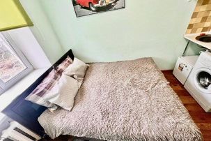 Оснащение: Студия поделена на зоны: кухня, обеденная зона, зона отдыха и сна. В зоне отдыха размещена двуспальная кровать. Кухня оборудована всем необходимым: варочная поверхность, микроволновая печь, холодильник, электрочайник, комплект посуды для приготовления пищи, стиральная машина автомат, а также набор тарелок и столовых приборов.