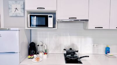 В кухне вы найдете всю современную бытовую технику: СВЧ-печь, плиту, холодильник, электрочайник, а также посуду и кухонные принадлежности.