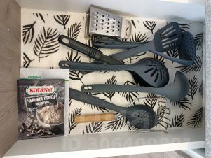 - Кухня полностью оборудована всем необходимым: посуда, столовые приборы (кастрюли, сковородки, лопатки)