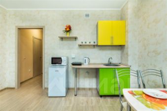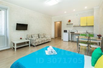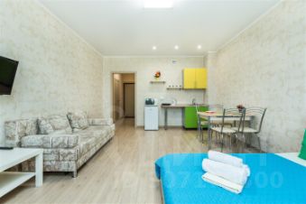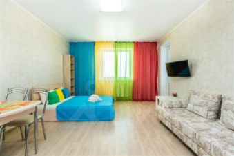 Однокомнатная квартира-студия в ярких тонах в новостройке. Размещение до 4 человек (двуспальная кровать, раскладывающийся диван).