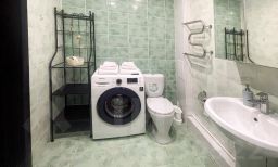 Также есть вся необходимая бытовая техника: плита, холодильник, чайник, СВЧ, фен, утюг, стиральная машина.