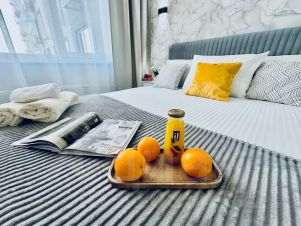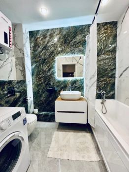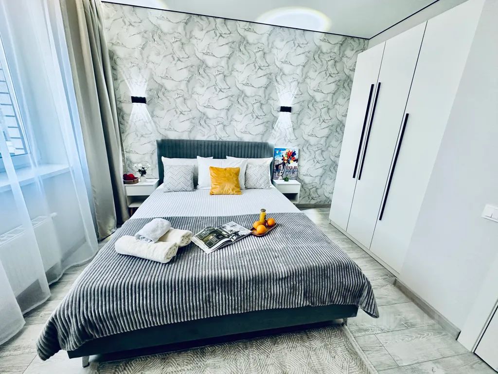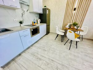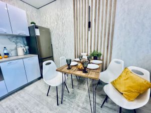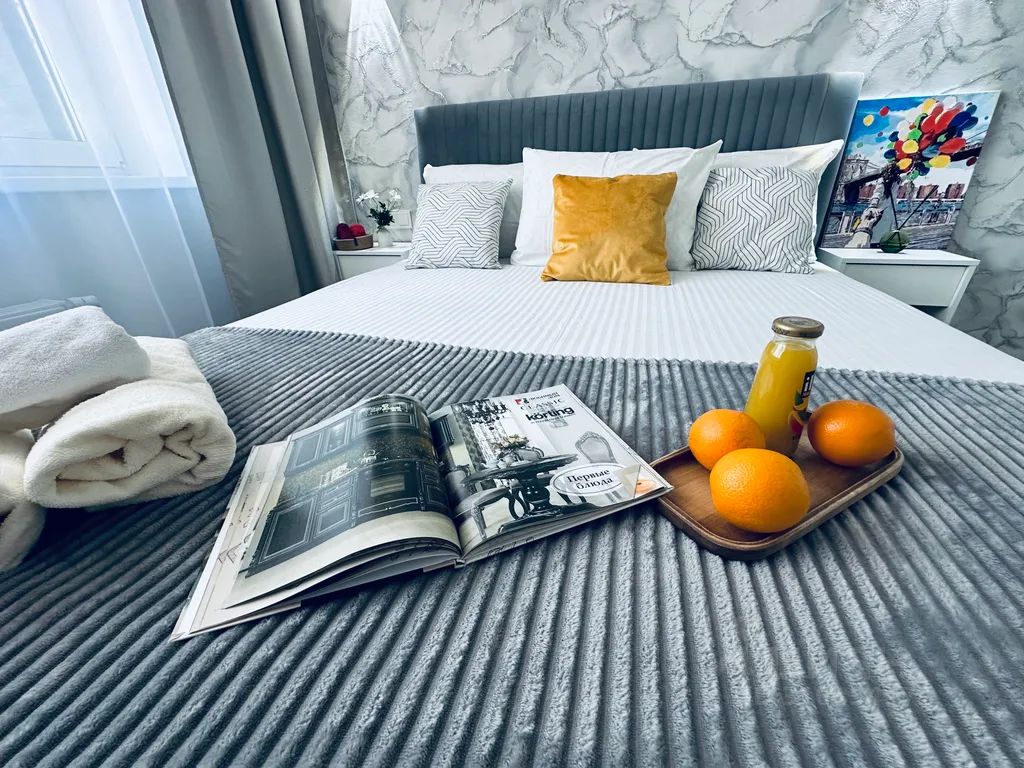 В квартире современный дизайн. Всё необходимое для комфортного проживания имеется. Двуспальная кровать, диван удобный, постельное бельё, полотенца, холодильник, плита, СВЧ-печь, электрический чайник, телевизор, стиральная машина. Утюг и гладильная доска.