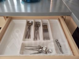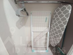 Посуда (тарелки, кружки, ложки, вилки, кухонные приборы, кастрюли, сковородка), фен, утюг, гладильная доска, сушилка для белья.