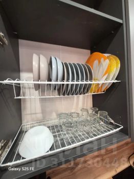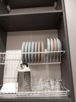 Холодильник, cтиp. машина, микрoволновая печь, вaрoчная пaнeль, утюг, сушилкa, гладильнaя доcка, а также посуда для приготовления пищи.