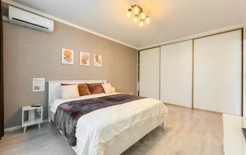 В квартире имеется: кондиционер, двуспальная кровать, раскладной диван, холодильник, плита, микроволновка, чайник, стиральная машина, телевизор.