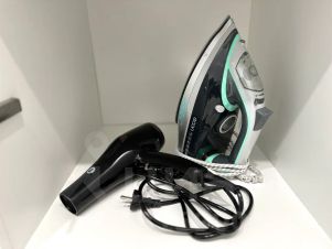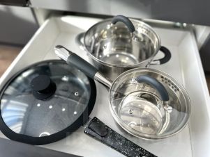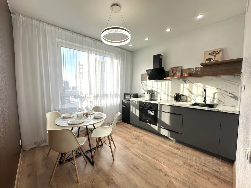 Современная бытовая техника: варочная панель, духовой шкаф, вытяжка, двухкамерный холодильник, электрочайник, СВЧ, фен, утюг, стиральная машина.