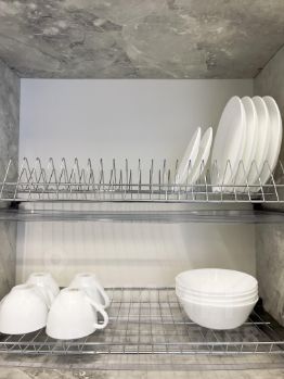 В кухне вы найдете всю современную бытовую технику: СВЧ-печь, плиту, холодильник, электрочайник, а также посуду и кухонные принадлежности.