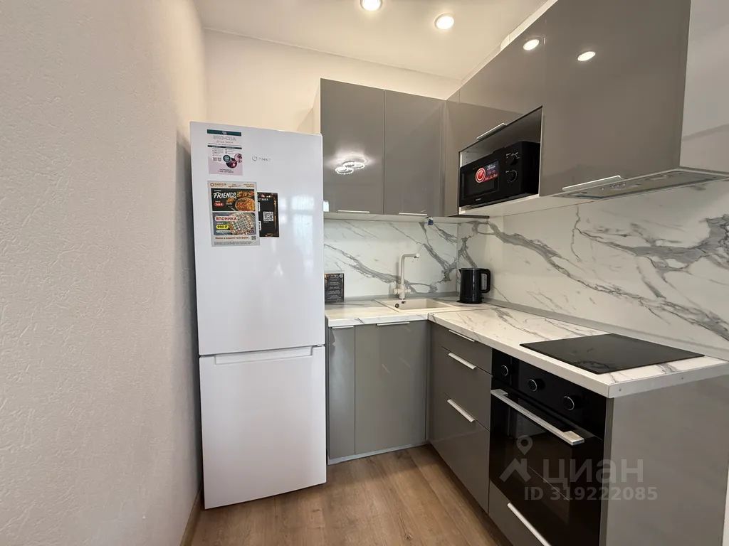 Современная бытовая техника: варочная панель, духовой шкаф, двухкамерный холодильник, электрочайник, свч, фен, утюг, стиральная машина.