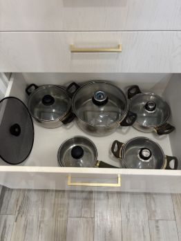 Вся необходимая посуда - столовые приборы, кастрюли , тарелки и т.д.