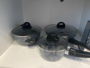 Полное оснащение кухонной зоны: варочная панель. Необходимая посуда для приготовления и употребления пищи.