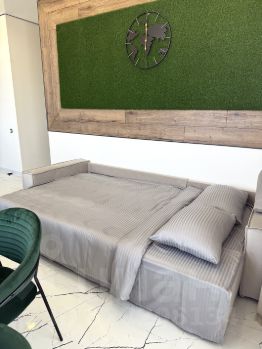 В квартире 1 двуспальная кровать в спальне, 1 двуспальный диван в детской, 1 двуспальный диван на кухне.