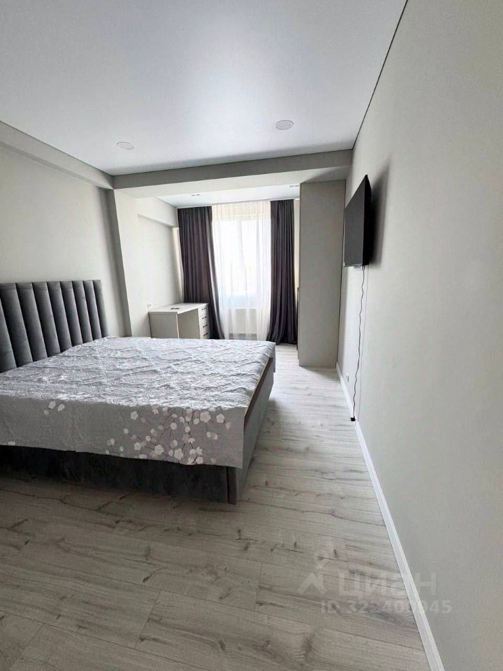Спальня: Уютная комната с двуспальной кроватью, современным интерьером и большими окнами, которые обеспечивают хорошее естественное освещение. Квартира оборудована для комфортного проживания в любое время года.
