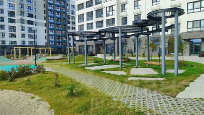 Закрытый благоустроенный двор: аккуратные дорожки, детская и спортивная площадки, зелёные насаждения и зоны отдыха.