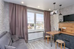 Полностью укомплектована техникой и мебелью: холодильник, микроволновая печь, диван, кровать, шкаф, стиральная машина.