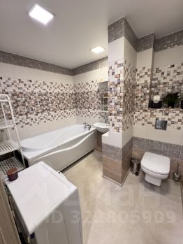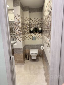 Большой совмещенный сан.узел, везде плитка. Есть стиральная машина, стеллаж для хранения, большая ванна, подвесной унитаз, полотенцесушитель и шкафчик с зеркалом.