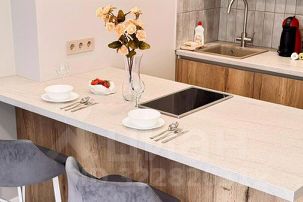 В кухне вы найдете всю современную бытовую технику: СВЧ-печь, посудомоечную машину, плиту, холодильник, электрочайник, а также посуду и кухонные принадлежности.