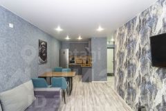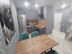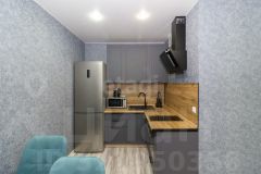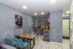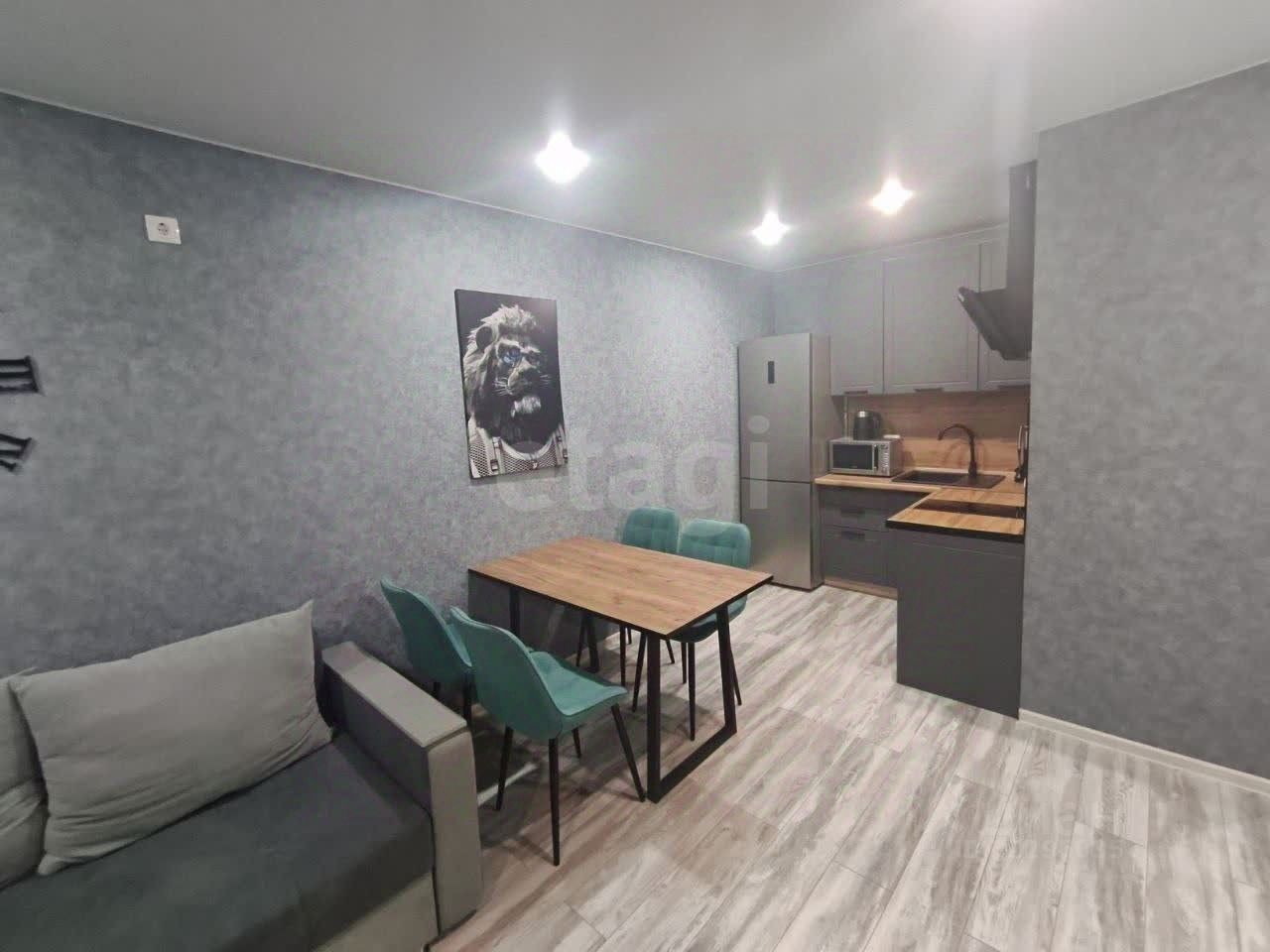 В кухне-гостинной установлен качественный кухонный гарнитур, встроенная варочная панель и духовой шкаф. Вытяжка установлена. Холодильник. Обеденный стол и мягкие стулья.