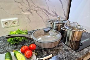 - На кухне имеется вся необходимая посуда для приготовления и принятия пищи; СВЧ-печь, эл. плита с духовкой, холодильник, электрочайник.