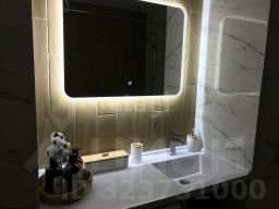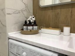 - Полностью укомплектована техникой и мебелью: диван, телевизор, кондиционер, кухонный гарнитур, варочная панель, холодильник, стол и стулья, стиральная машина.
