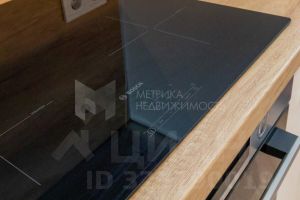 • Кухня-гостиная: гарнитур со встроенной техникой (холодильник, индукционная варочная панель, духовой шкаф, посудомоечная машина), диван, телевизор, обеденный стол со стульями
