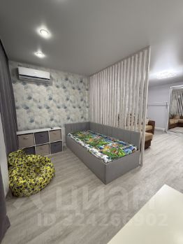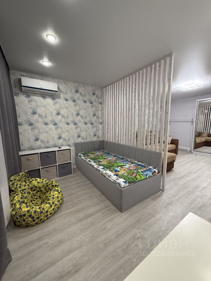 Комната: шкаф-купе, раскладной диван, односпальная кровать, кондиционер, консоль с полками, телевизор 55", журнальный столик.