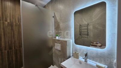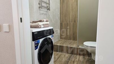 Санузел совмещённый: тёплый пол, душевая кабина, стиральная машина, полотенцесушитель электрический и тумба для хранения.