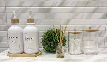 Постельное белье, комплект полотенец, индивидуальные средства личной гигиены, гель для душа, шампунь.