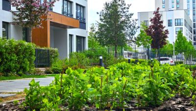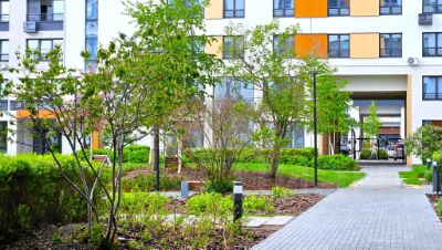 Во дворе дома предусмотрены места для занятий спортом, детских игр и спокойного отдыха.
