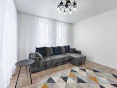 В третьей комнате мягкий угловой диван, журнальный столик, телевизор Смарт-ТВ с Алисой, на полу ковёр в стиле Хай-Тек : можно использовать как гостиную или гостевую. Светлая угловая комната с выходом на застеклённый балкон. Из окна открывается красивый вид на рощу и частный сектор.