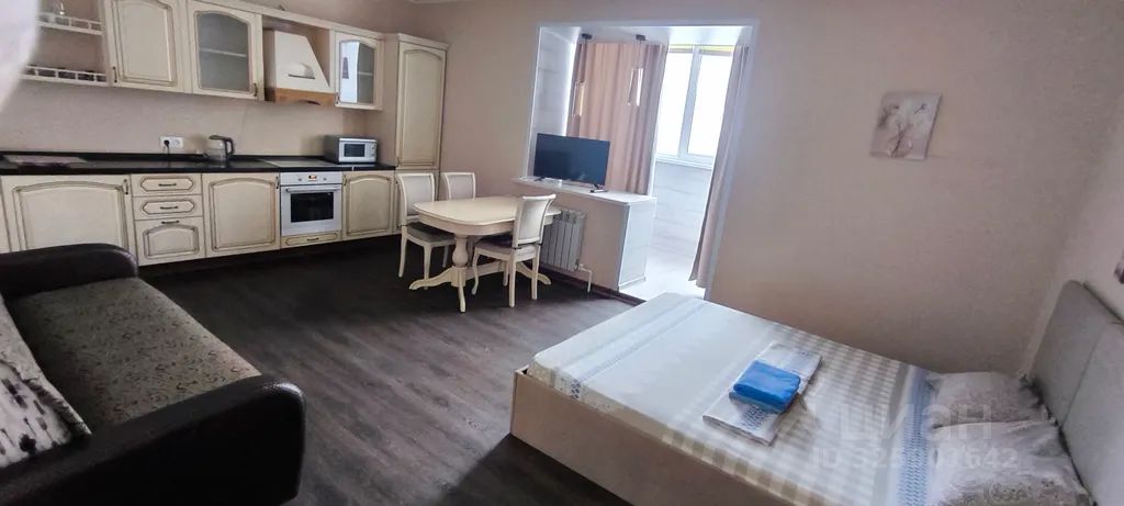 Комната разделена на 2 зоны - кухонная зона и спальня. Здесь просторно и комфортно. Теплый балкон с завораживающим видом с 18 этажа