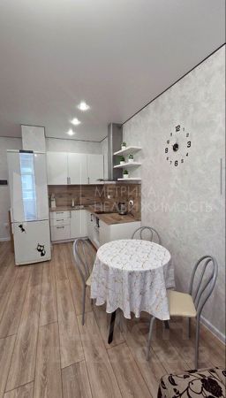 Просторная кухня-гостиная площадью 16,26 м² оборудована необходимой техникой: холодильник, варочная панель. микроволновка, гарнитур, стол, стулья, чайник, посуда.