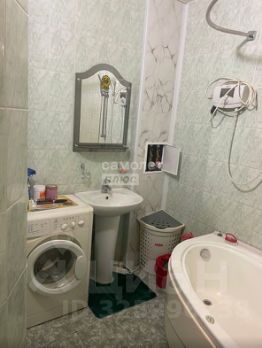 В ванной комнате ; стиральная машина, проточный обогреватель воды, акриловая угловая ванна, зеркало, раковина с подставкой.