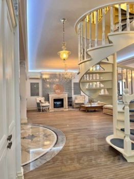 Здесь царит дух света и открытости. Гостиная с камином от творческой мастерской Мошкиных — это скульптурный объект, создающий живое тепло. Паркетный пол ведет к монументальной лестнице той же мастерской — она не просто соединяет этажи, а является доминантой интерьера. Кухня- гостиная оснащена бесшумной техникой премиум-класса: встроенный холодильник и морозильная камера LIЕВНЕRR, духовой шкаф и варочная панель SМЕG. Мраморные подоконники и авторская мраморная розетка подчеркивают материальность и вкус. Итальянские люстры льют свет на изысканные линии итальянской же мебели. Венецианское зеркало добавляет исторического шарма и глубины. Сан. санузел оборудован сантехникой Villеrоy & Восh, душевая кабина для динамичного начала дня. Просторная гардеробная позволяет сохранять гармонию и порядок.