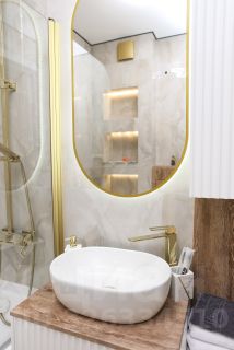 Спальня - уголок с мягким постельным бельем из хлопка и большой комфортный кроватью. Во второй спальне полутораспальная кровать. Диван в кухне-гостиной легко раскладывается для сна гостейВанная аккуратная и функциональная, с современной сантехникой и чистыми линиями. К каждой детали учтено удобство и уют: розетки, полки, тихая техника.