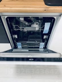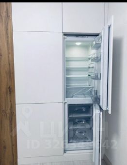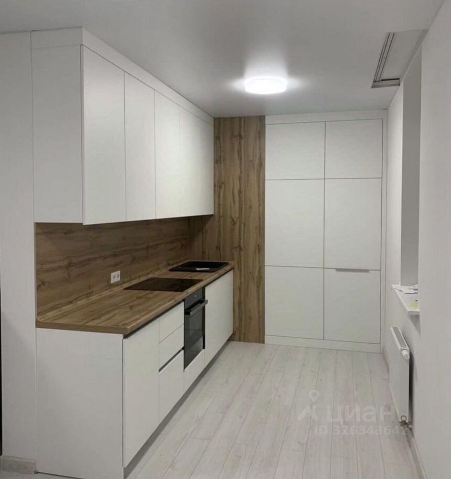 Техника на кухне встроенная: посудомоечная машина, духовой шкаф с свч, индукционная плита, вытяжка и холодильник.