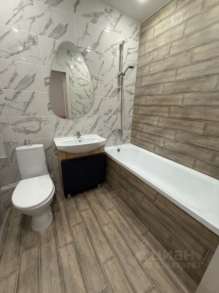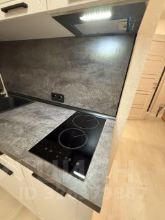В квартире современный ремонт: на полу ламинат, ванна в керамограните. Есть кухонный гарнитур с варочной панелью и вытяжкой. в ванной стиральная машина-автомат.