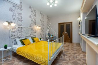 Просторная комната и кухня. В комнате большая двуспальная кровать.