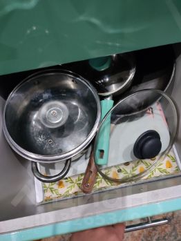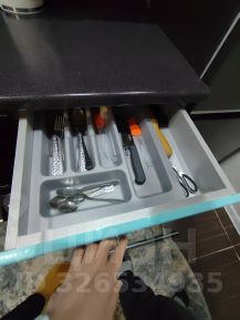 кухня выполнена в современном стиле, упакована вплоть до посуды