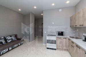 В студии для вашего комфорта есть стиральная машинка-автомат, холодильник, кухонный гарнитур, электроплита с духовым шкафом, микроволновая печь, кухонный стол с 2 стульями, диван-кровать, гардеробная в прихожей (на фото ее нет)
