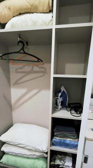 Есть все для комфортного проживания, в том числе посуда, одеяла, подушки, гладильная доска и утюг, сушилка для белья, фен.