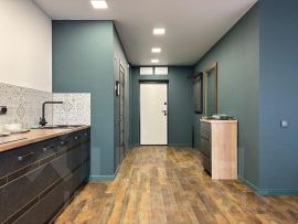 — Нестандартно длинная кухня, оснащена всем! Капсульная кофемашина, приборы, бокалы (для вина, шампанского), рюмки. Если решите что то приготовить, все для этого есть, сковорода, кастрюля, ножи.
