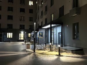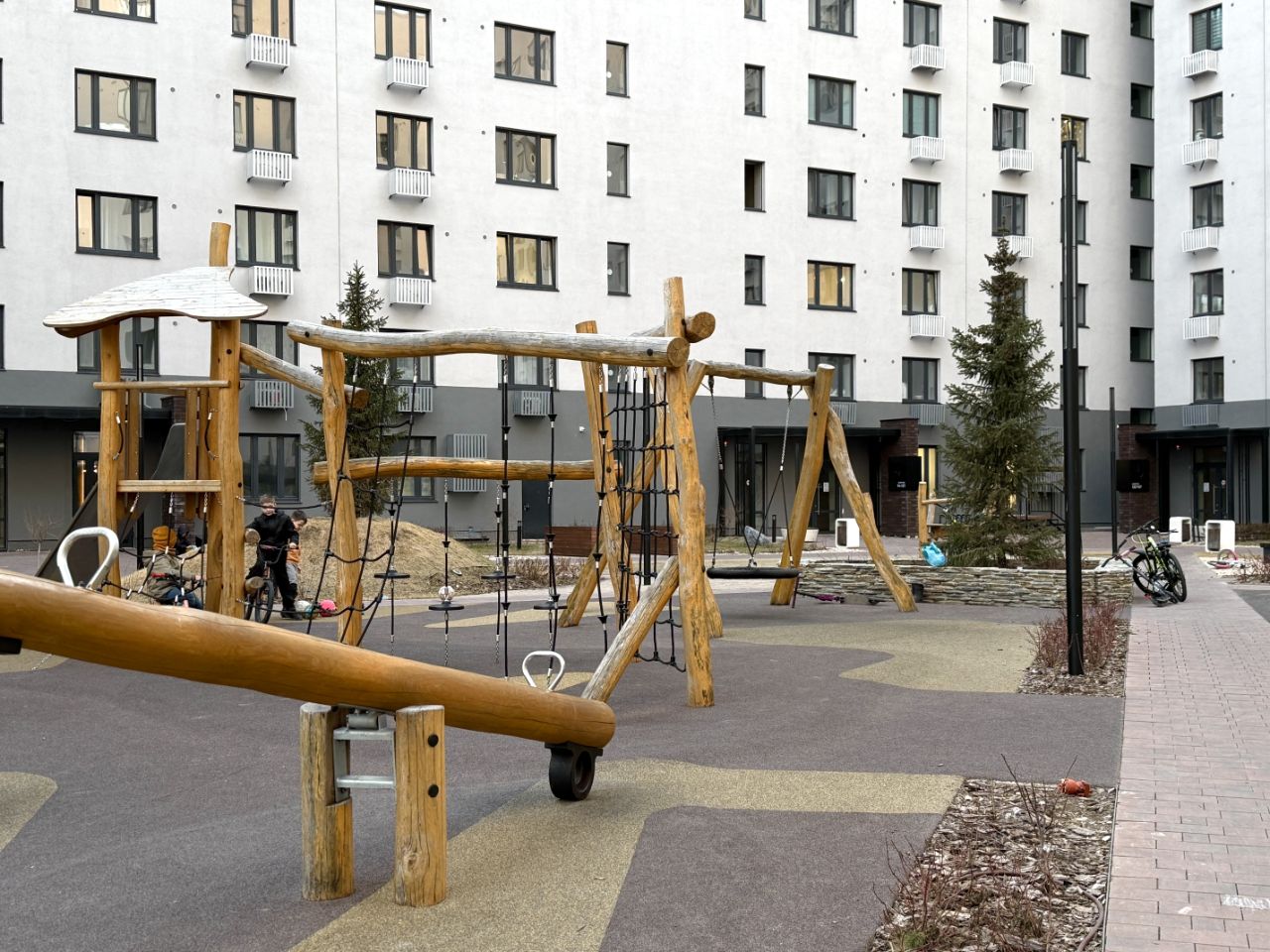 Есть большая бесплатная парковка (всегда есть места) детская площадка, спортивная площадка (на закрытой территории)