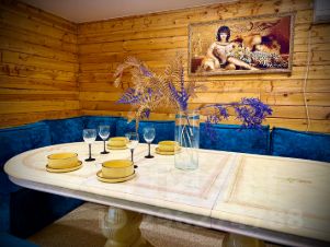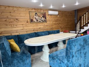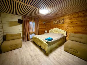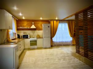 На территории есть баня на дровах , оплачивается отдельно. В доме самая настоящая деревенская атмосфера , запах свеже вырубленного леса. На территории посеян газон, имеется мангал из кирпича, что представляет безопасность. Дом находиться среди жилых домов, вокруг тишина и воздух чище чем в городе, хотя коттедж находится в черте города.