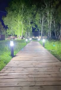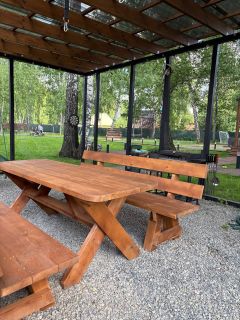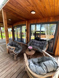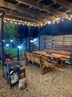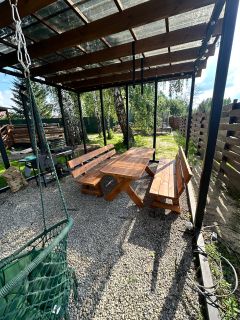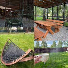 Мангаланая зона - это не просто мангал. Это отдельная терраса с подвесными качелями, незабываемым освещением и большим столом.
