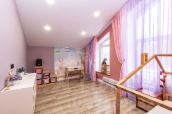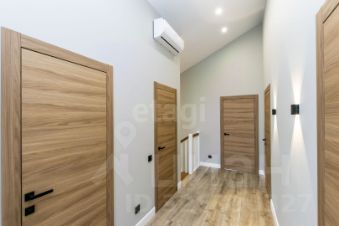 Второй этаж: три спальни, гардеробная, санузел. Высокие потолки создают ощущение простора, а натуральные материалы придают интерьеру уют. Полы на первом этаже выложены плиткой (керамогранит), включая фартук кухонного гарнитура. Все подоконники деревянные, обои под покраску, два эксклюзивных панно.