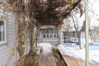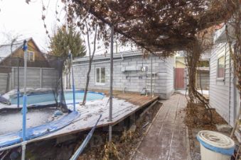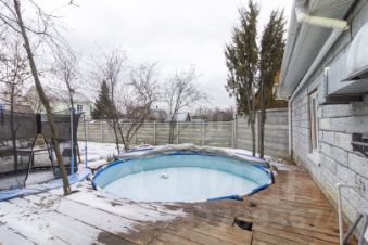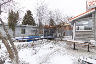 Бассейн: Каркасный бассейн на 20 м с подогревом, тентом и фильтром. Углублен в землю. Рядом — батут