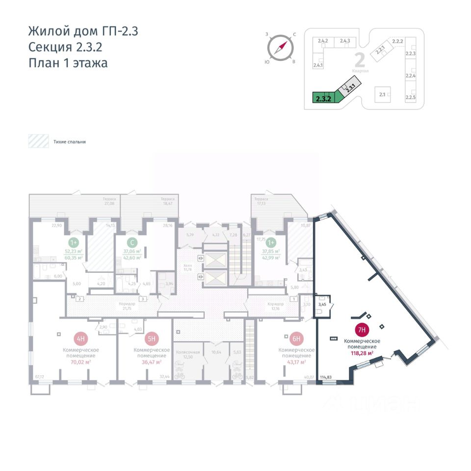 Предлагаем коммерческую недвижимость в доме ГП-2.3 общей площадью: 118,28 кв.м. Жилой комплекс с собственным лесопарком, расположенный в живописном районе Тюменской слободы, в 5 минутах езды от Московского тракта. Архитекторы спроектировали микрорайон по принципу "зеленого каркаса". Другая фишка проекта — спальни со звукоизоляцией. Наши проектировщики разработали ряд технологических решений, призванных поглощать как ударный, так и воздушный шум. Больше света: дома не соединены между собой, чтобы не создавать эффект "двора-колодца". Это позволит наполнить дворы солнцем и сохранить в каждой квартире максимум света. Сити-хаусы на 1 этаже - квартиры с террасами, отдельным входом и высотой потолка 3,12 м. 7 кварталов, спроектированных по принципу "дворы без машин", направлены на создание комфортной, городской среды. Этажность домов переменная: от 7 до 17 этажей.
