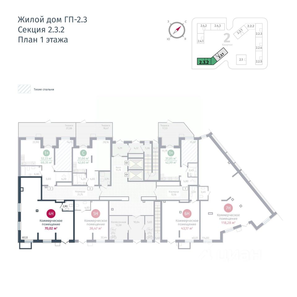 Предлагаем коммерческую недвижимость в доме ГП-2.3 общей площадью: 70,02 кв.м. Жилой комплекс с собственным лесопарком, расположенный в живописном районе Тюменской слободы, в 5 минутах езды от Московского тракта. Архитекторы спроектировали микрорайон по принципу "зеленого каркаса". Другая фишка проекта — спальни со звукоизоляцией. Наши проектировщики разработали ряд технологических решений, призванных поглощать как ударный, так и воздушный шум. Больше света: дома не соединены между собой, чтобы не создавать эффект "двора-колодца". Это позволит наполнить дворы солнцем и сохранить в каждой квартире максимум света. Сити-хаусы на 1 этаже - квартиры с террасами, отдельным входом и высотой потолка 3,12 м. 7 кварталов, спроектированных по принципу "дворы без машин", направлены на создание комфортной, городской среды. Этажность домов переменная: от 7 до 17 этажей.