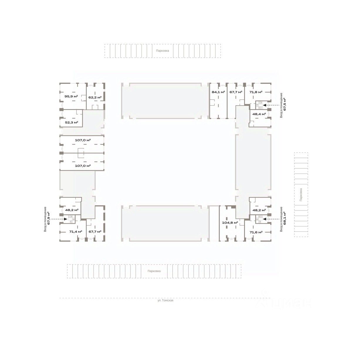 Помещение свободного назначения на 1 этаже, общая площадь 106.97 кв.м., без отделки. Стоимость помещения 24,150,000 руб., цена за кв.м 225,764 руб.